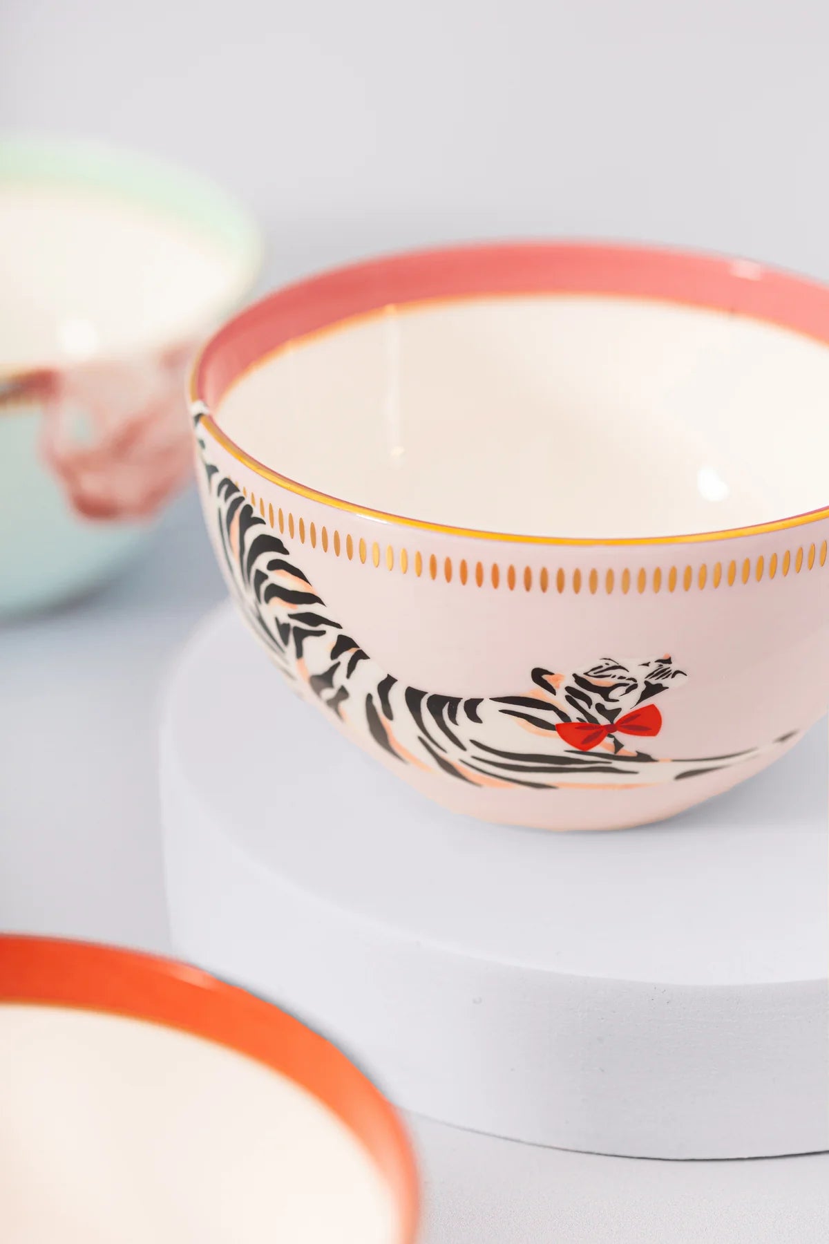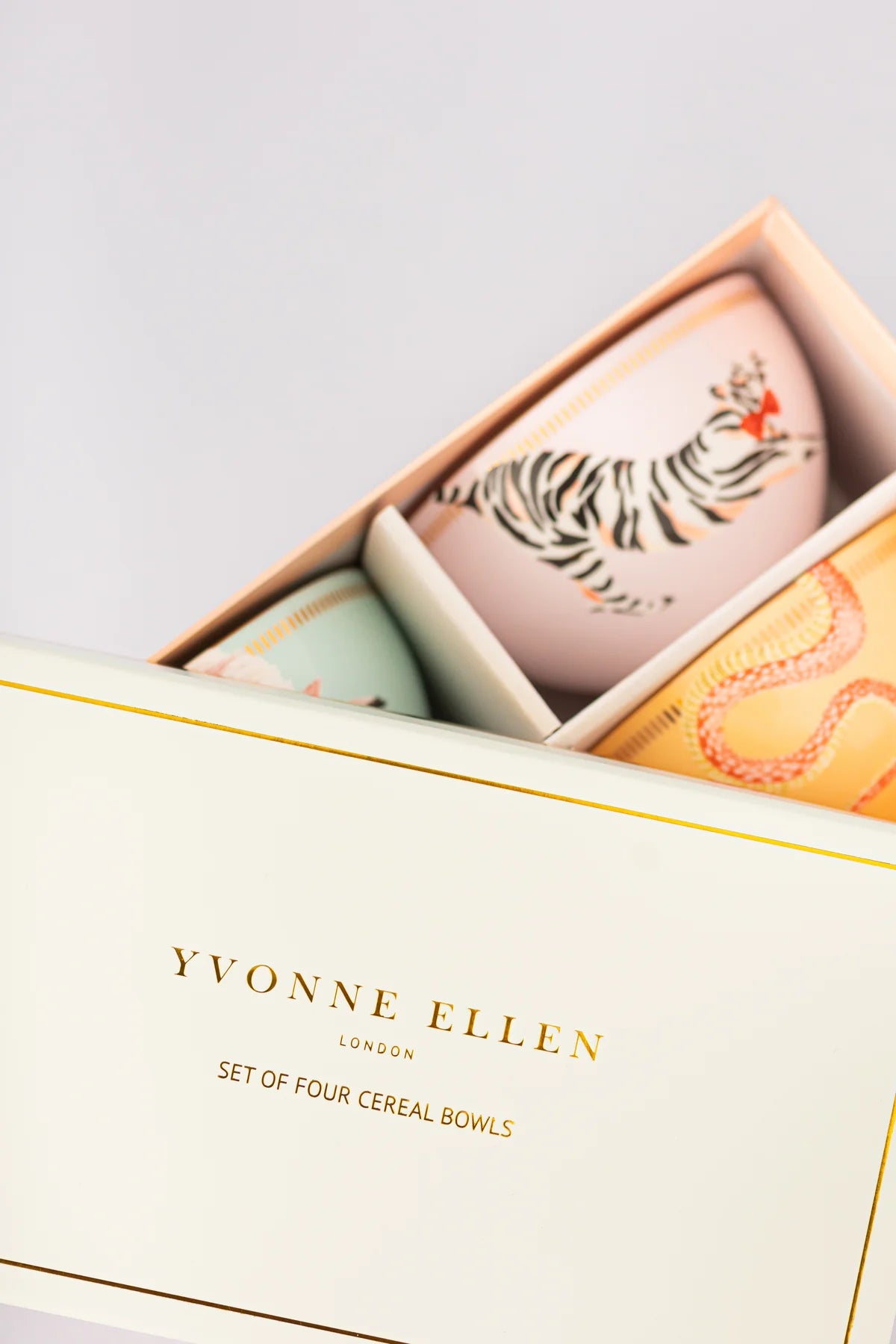 This quirky set is the embodiment of the Yvonne Ellen style: animal life juxtaposed in original, colourful compositions. The pastel cereal bowls are adorned with four of my iconic animals decorated with cutesy accessories. The gold details make this set perfect for adding a funky feel to your next dinner party!