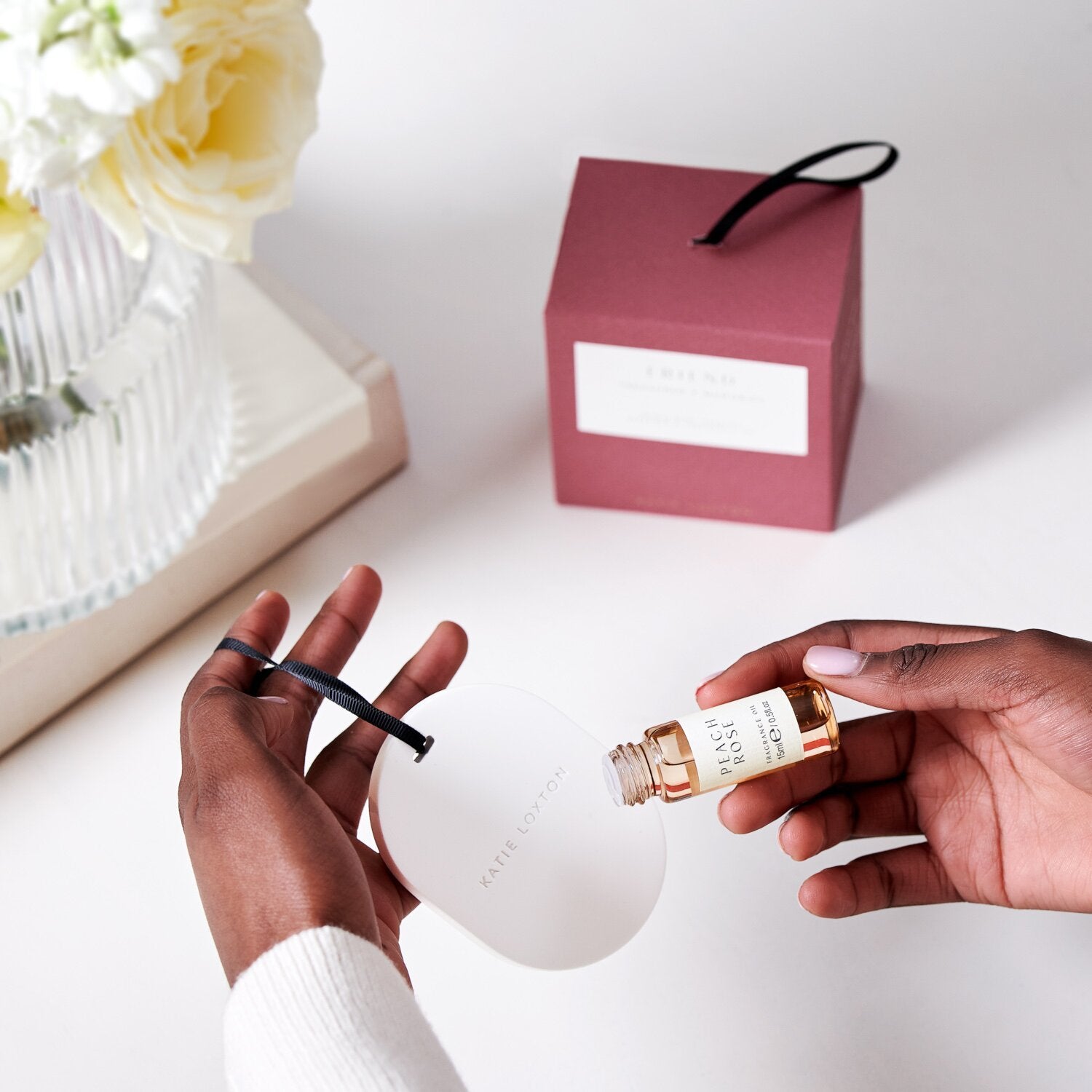Introducing theĀ 'Friend' Ceramic Hanging Diffuser in the uplifting scent of Peach Rose And Sweet Mandarin. This sleek, oval-shaped design includes a ribbon for hanging in your home and comes with a 15ml bottle of scented oil. Beautifully packaged in recyclable gift packaging, this diffuser makes the perfect gift or self-treat.