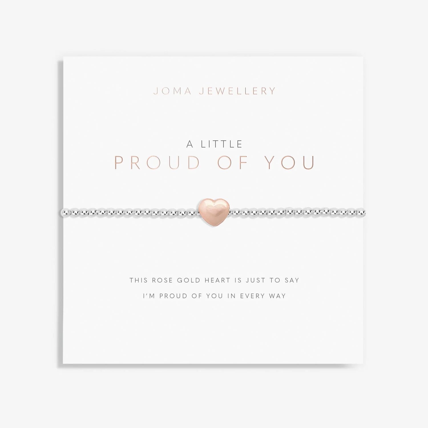 Whether she's gotten a promotion at work or a great grade at school, shine a light on her amazing achievement with thisĀ 'A Little' Proud Of You Bracelet. Silver-plated beads shine alongside a rose gold-plated heart charm to make a subtle statement. Wrapped around a gorgeous card and accompanied by a lovely poem, this bracelet is absolutely perfect for gifting.