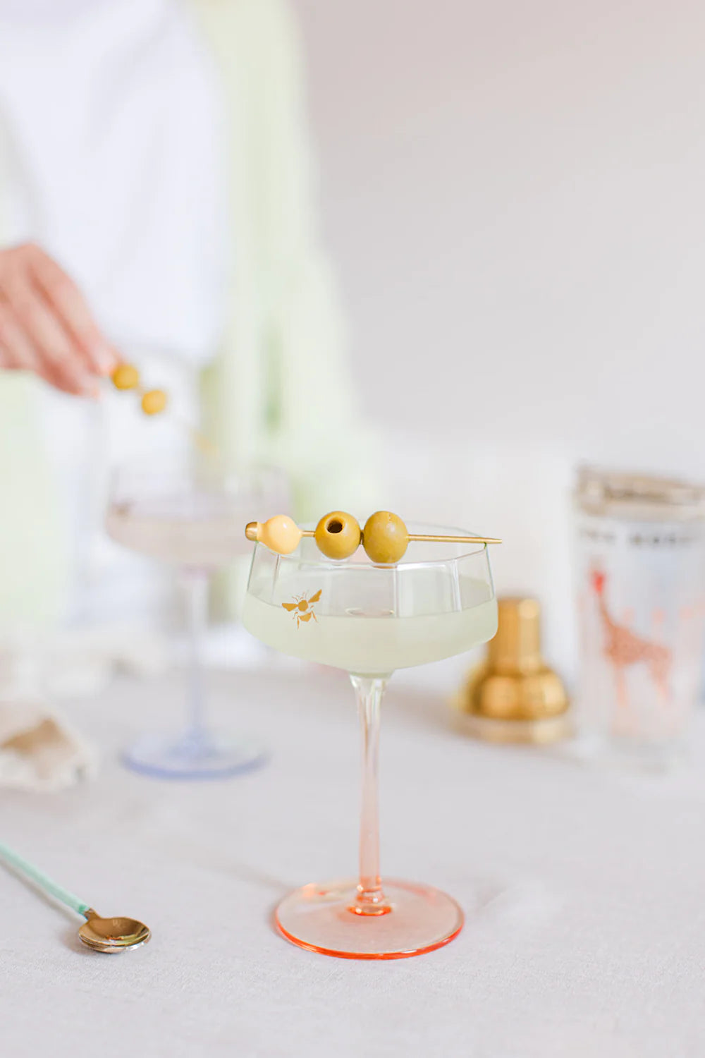 How amazing are these bee coupe glasses? These pastel coloured coupes adorned with an Yvonne Ellen trademark bumblebee! Finished with a gold gilded rim, this coupe glass is a must have!