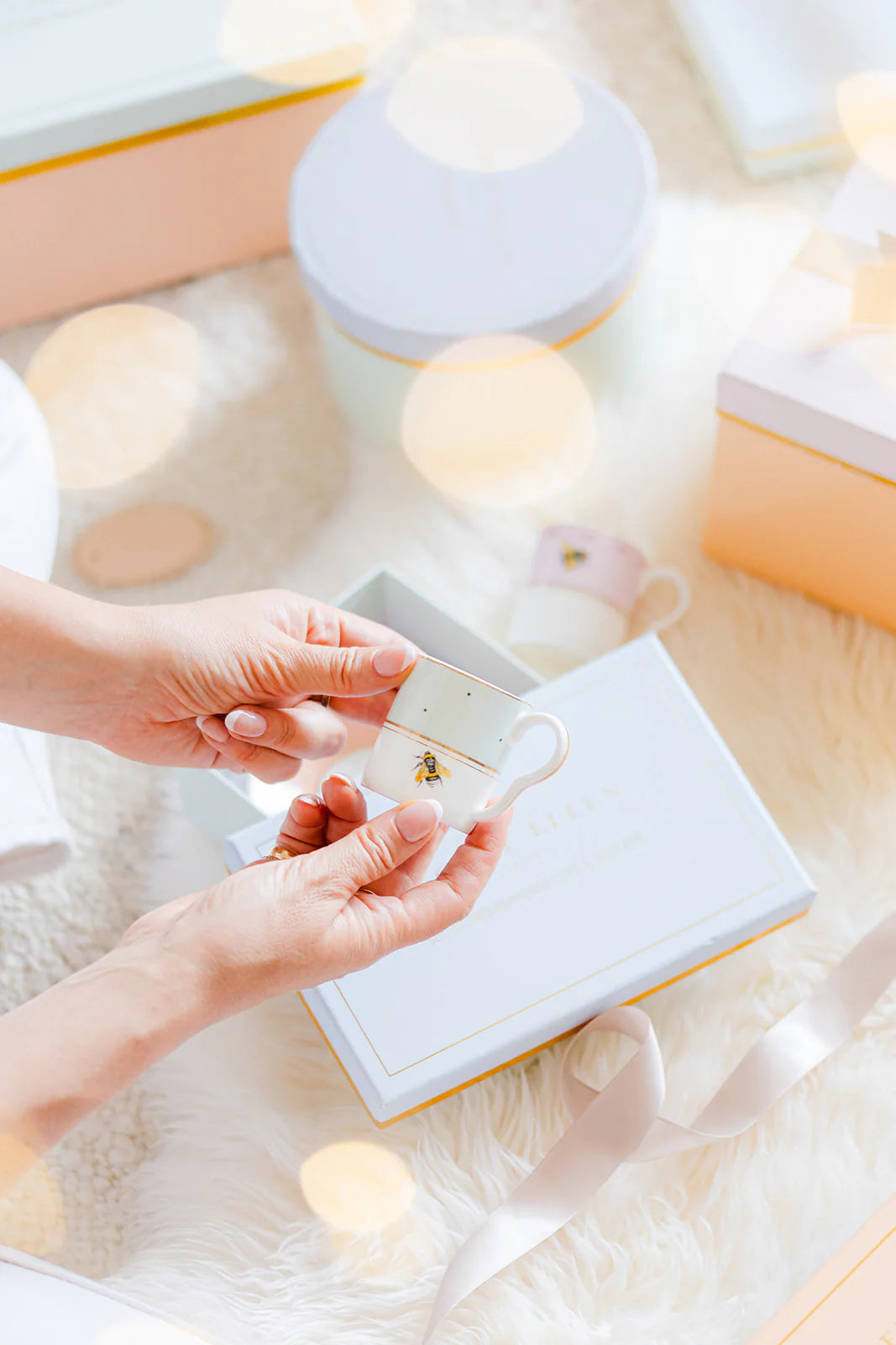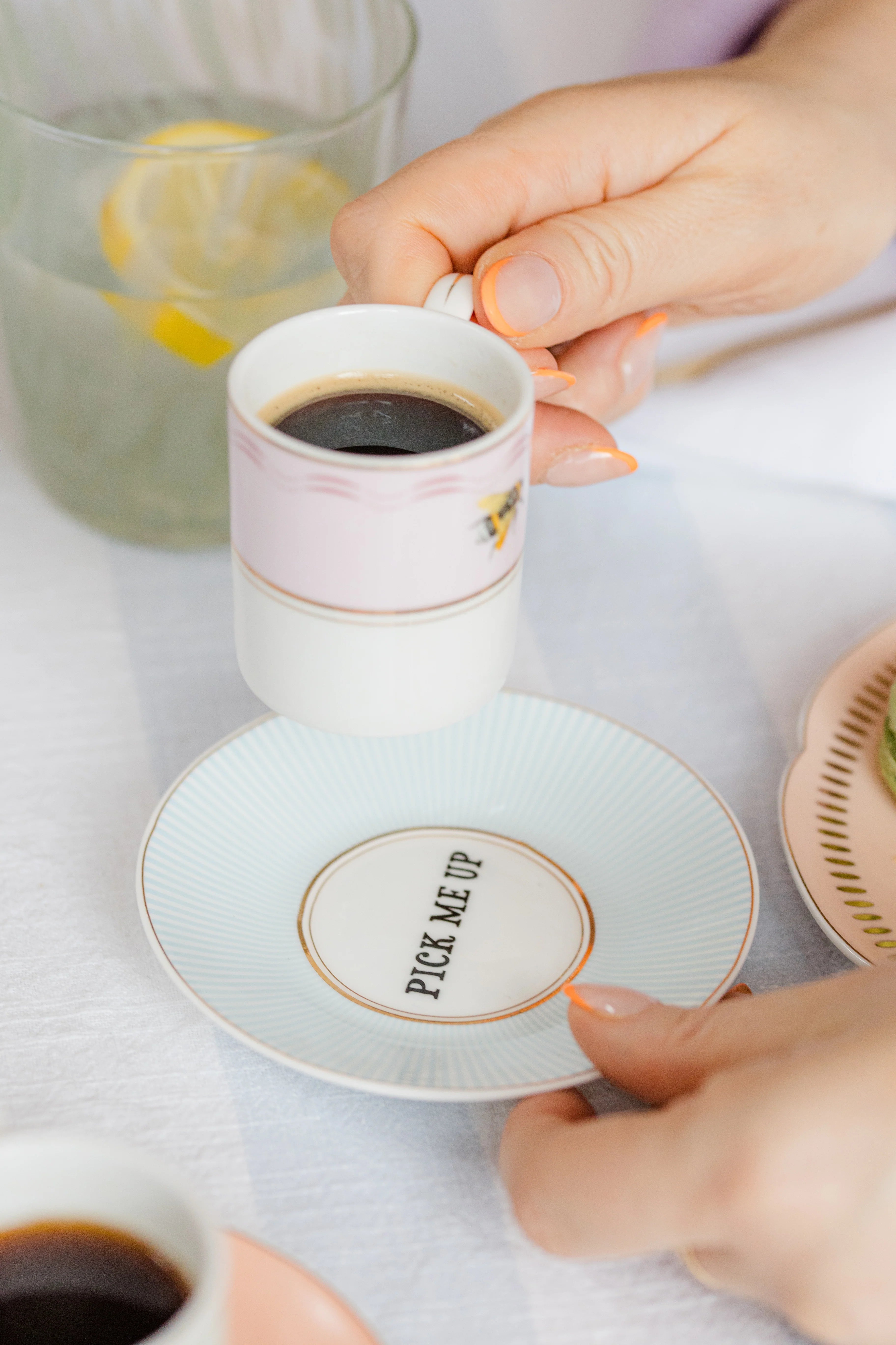 This quirky set is the embodiment of the Yvonne Ellen style: vintage patterns, cute slogans and of course a bee! The pastel espresso cups and saucers are adorned with two iconic slogans 'hot stuff' and 'pick me up'. The perfect size for a much needed caffeine hit!