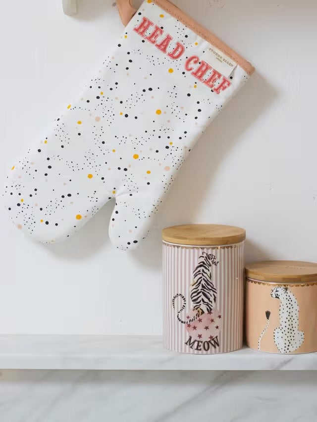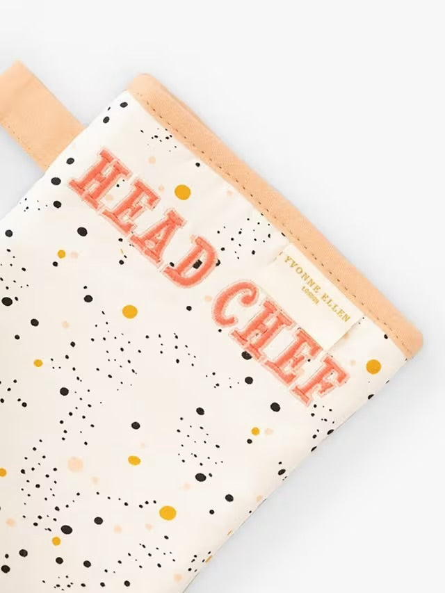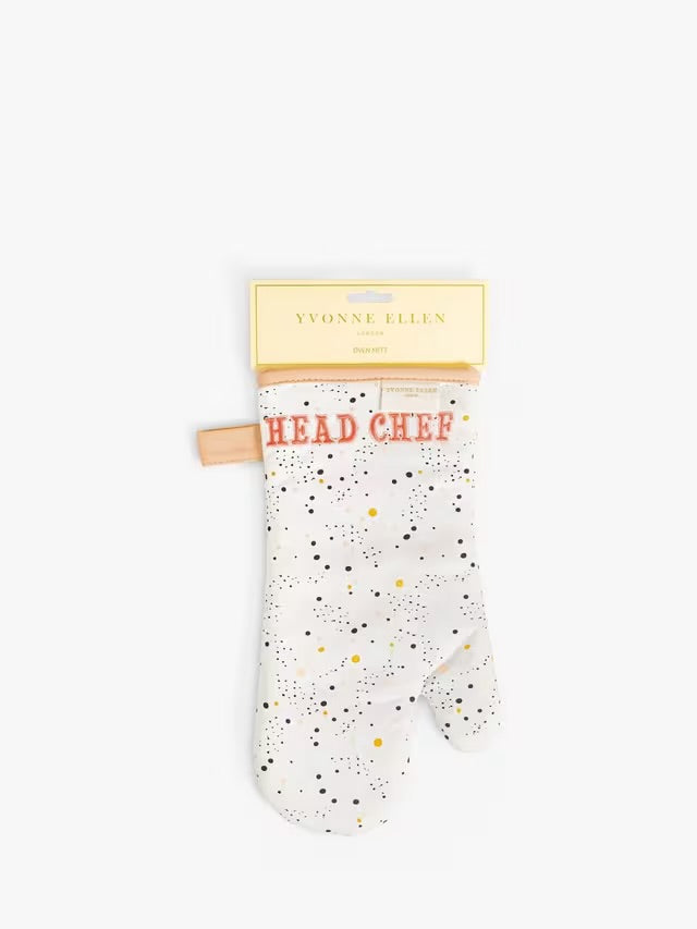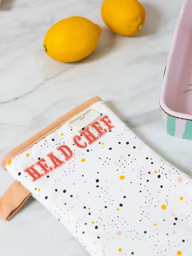 Add some charm to your kitchen with this hear chef reversible oven glove! They're thickly quilted to protect your hands in style with designs on both sides. Match with other kitchen accessories for a stylish finished look. Matching apron, tea towels and double oven glove available!