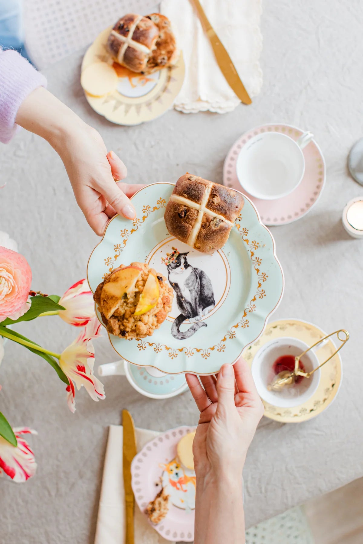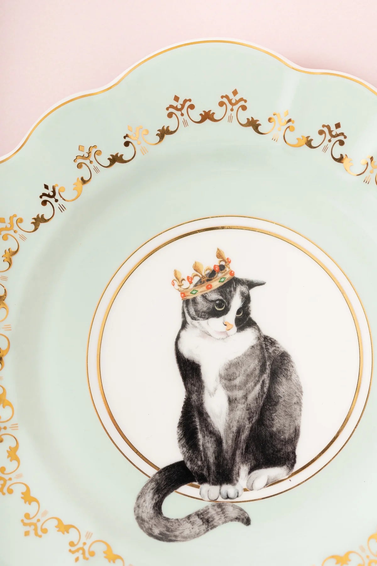 Indulge in the charm of England with our new "Best of British" range. Classic English animals meet vintage and royal-style gold accents on delightful tableware. From swans on teacups to pigeons on plates, each piece tells a whimsical tale. Our classic black cat sits regally on this plate with intricate gold detail on a soft pastel green background.Â